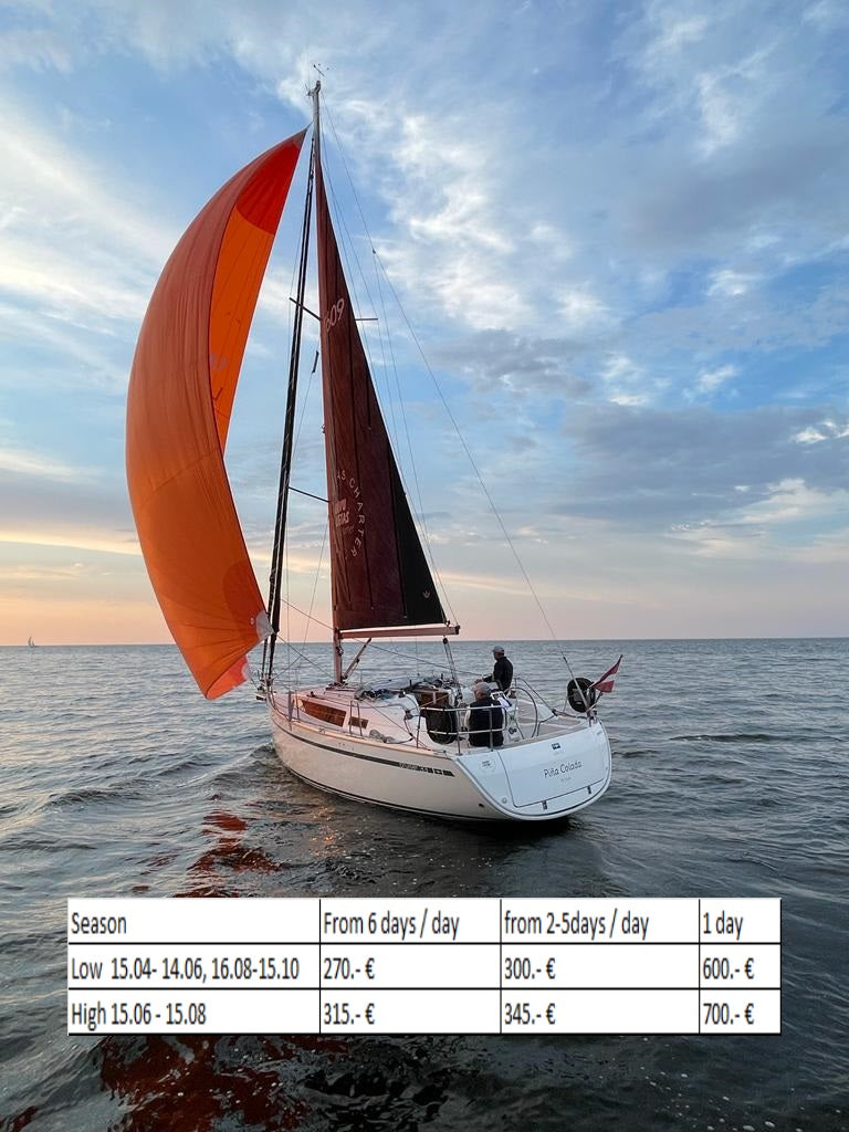 Jahtas nomas maksa: rezervēšana 150 EUR(*). 50% avanss 4 nedēļas pirms jahtas saņemšanas. 50% jahtas saņemšanas brīdī. Pie saņemšanas ir jāiemaksā drošības nauda 1500 € . Drošības nauda pēc jahtas atdošanas un pārbaudes tiek atgriezta.